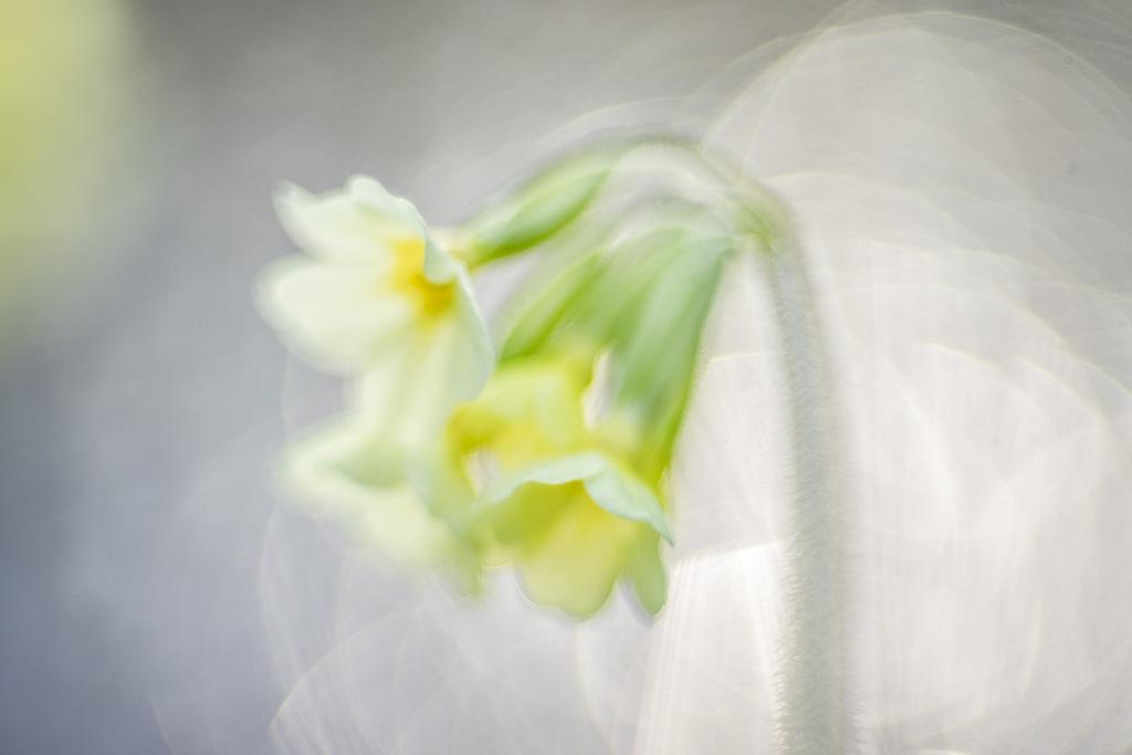 Schlüsselblume am Rand eines Wassergrabens. Ein mit Zwischenring kombiniertes, sehr lichtstarkes 50 mm-Objektiv sorgt für minimale Schärfentiefe und eine weiche, malerische Wiedergabe der Blüten. Die Reflexionen des Wassers sorgen für ein interessantes Lichtspiel.